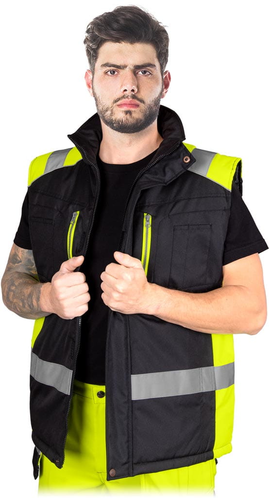 ASKER-V. - powłoka 100% poliester o gramaturze 180 g/m2 - wyściółka 100% poliester o gramaturze 280 g/m2 - podszewka 100% poliester o gramaturze 60 g/m2 - zapinany na zamek błyskawiczny z dodatkowym zapięciem na rzepy - kołnierz w formie stójki - cztery kieszenie na klatce piersiowej, w tym dwie zapinane na suwak - dwie kieszenie w dolnej części bezrękawnika - dodatkowe kieszonki na akcesoria - po wewnętrznej stronie kieszeń zapinana na rzep - pasy odblaskowe zapewniają lepszą widoczność
