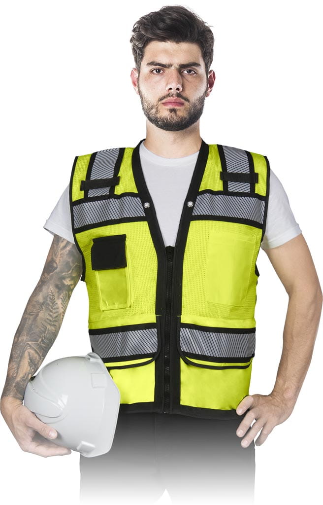 dzianina: 100% poliester - gramatura 130 g/m2 - suwaki po bokach zapewniająca lepszą wentylację - zapinana na zamek błyskawiczny - kieszenie na klatce piersiowej, w tym jedna na telefon zapinana na rzep oraz jedna podwójna z miejscem na przybory np. długopisy - dwie kieszenie po bokach w dolnej części zapinane na rzepy - uchwyty na latarkę - wykończona czarną lamówką - idealna dla drogowców