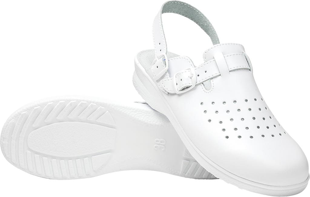 - wierzch perforowany ze skóry naturalnej z paskiem do regulacji tęgości, odporny na codzienne mycie i dezynfekcję