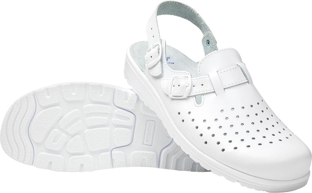 - wierzch perforowany ze skóry naturalnej białej z paskiem do regulacji tęgości, odporny na codzienne mycie i dezynfekcję
