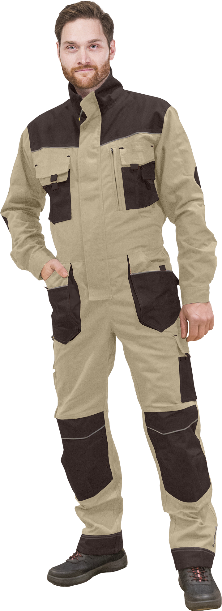 - trzy kieszenie na klatce piersiowej, w tym jedna na rzep, jedna na suwak i jedna na telefon, dwie wąskie kieszonki na przybory np. długopis - na ramionach, kieszeniach, kolanach, łokciach oraz na dole nogawek dodatkowe wzmocnienie co zwiększa wytrzymałość kombinezonu na przetarcia