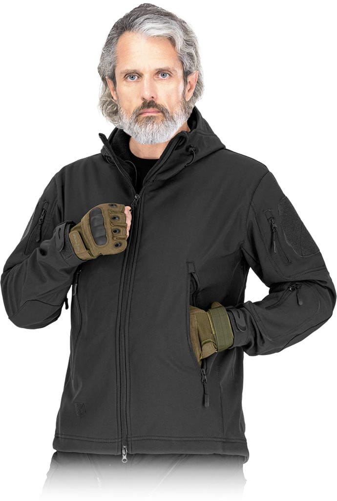 trójwarstwowa tkanina softshell: 100% poliester, membrana TPU, polar 100% poliester - gramatura 310 g/m2 - materiał SOFTSHELL - chroni przed deszczem oraz wiatrem, a jednocześnie pozwala skórze oddychać - zapinana na suwak - kaptur z daszkiem ściągany na troczki z możliwością zwinięcia i przypięcia dodatkowym materiałem z rzepami na karku - dwie kieszenie po zewnętrznej stronie zapinane na suwak oraz kieszeń wzdłuż dolnej partii pleców - na rękawach trzy kieszenie zapinane na suwak - rękawy zakończone na rzep - dół kurtki z możliwością ściągnięcia za pomocą troczków - na ramionach rzepy przeznaczone na różnego typu emblematy i odznaczenia - dedykowana dla miłośników militariów, podróżników, fanów paintballu - idealna dla leśników i rybaków