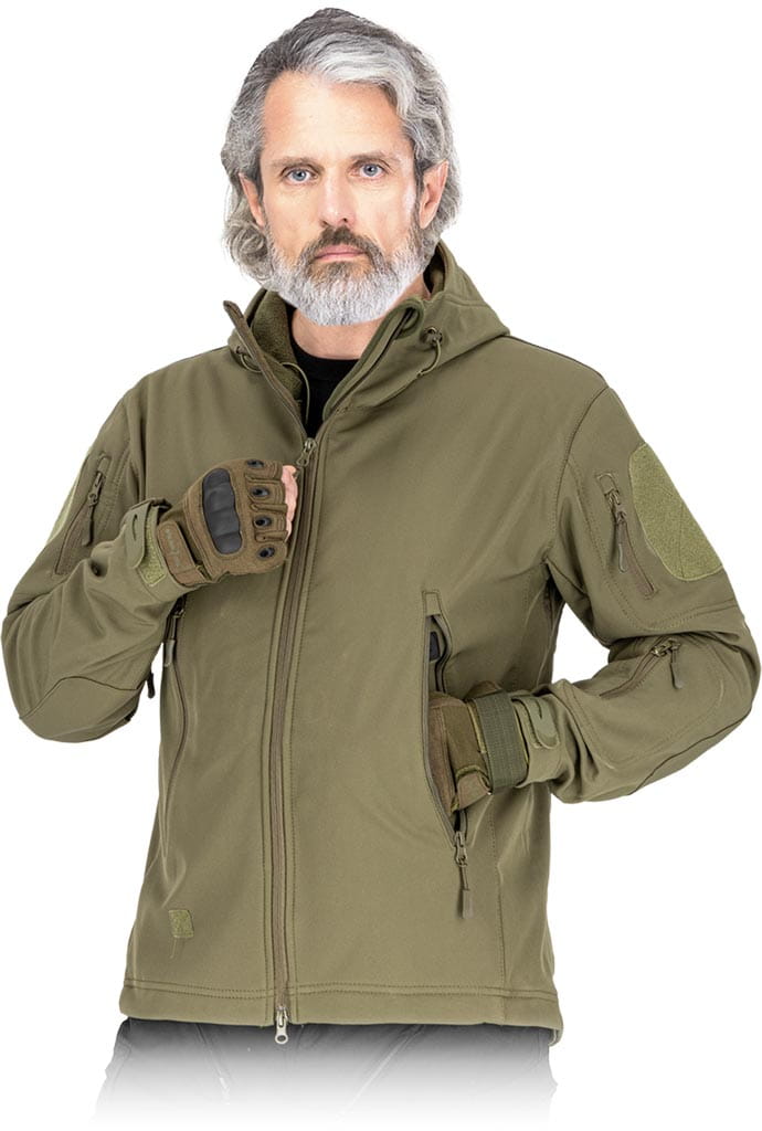 trójwarstwowa tkanina softshell: 100% poliester, membrana TPU, polar 100% poliester - gramatura 310 g/m2 - materiał SOFTSHELL - chroni przed deszczem oraz wiatrem, a jednocześnie pozwala skórze oddychać - zapinana na suwak - kaptur z daszkiem ściągany na troczki z możliwością zwinięcia i przypięcia dodatkowym materiałem z rzepami na karku - dwie kieszenie po zewnętrznej stronie zapinane na suwak oraz kieszeń wzdłuż dolnej partii pleców - na rękawach trzy kieszenie zapinane na suwak - rękawy zakończone na rzep - dół kurtki z możliwością ściągnięcia za pomocą troczków - na ramionach rzepy przeznaczone na różnego typu emblematy i odznaczenia - dedykowana dla miłośników militariów, podróżników, fanów paintballu - idealna dla leśników i rybaków