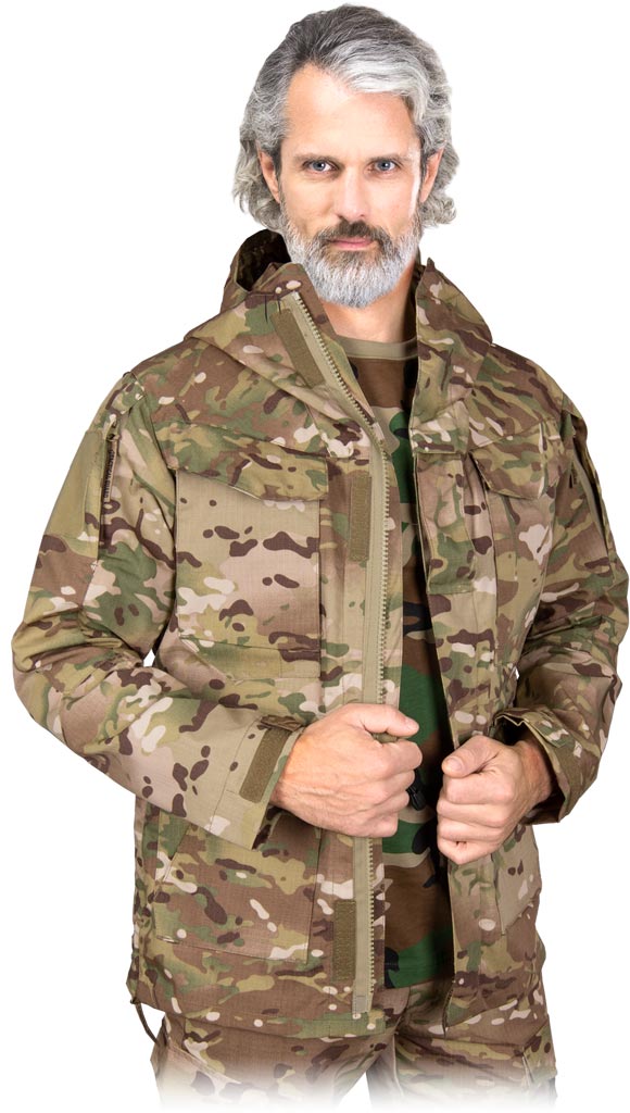 stop. - 65% poliester, 35% bawełna - gramatura 210-220 g/m2 - tkanina typu rip-stop - zabezpiecza przed rozdarciem w momencie zaczepienia o wystający przedmiot - zapinana na dwustronny suwak z dodatkowym zapięciem na rzepy - kaptur z daszkiem z możliwością zwinięcia i zapięcia na guzik - rękawy zakończone na rzep - od wewnątrz gumka do ściągnięcia kurtki w pasie, dzięki czemu można ją dopasować do sylwetki i zabezpieczyć przed dostaniem się wiatru - podwójne kieszenie: dwie na klatce piersiowej oraz dwie w dolnej partii kurtki - na rękawach kieszenie zapinane na suwak - otwór na słuchawki wewnątrz kurtki - po bokach kurtki dodatkowe suwaki dające możliwość wentylacji, które w pozycji otwartej utrzymywane są przez magnetyczne zamknięcia - dedykowana dla miłośników militariów, podróżników, fanów paintballu - idealna dla leśników i rybaków