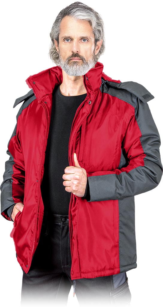 powłoka 100% poliester o gramaturze 120 g/m2 - wyściółka 100% poliester o gramaturze 280 g/m2 - podszewka 100% poliester o gramaturze 60 g/m2 - wstawki z czarnego materiału 100% poliester o gramaturze 180 g/m2 - zapinana na suwak z dodatkowym zapięciem na napy - kołnierz w formie stójki - odpisuwany kaptur z dodatkowym zapięciem na rzep dla lepszej ochrony głowy przed chłodem - dwie kieszenie po zewnętrznej oraz jedna na klatce piersiowej zapinane na suwak - po wewnętrznej stronie dodatkowa kieszeń zapinana na rzep - rękawy zakończone ściągaczem