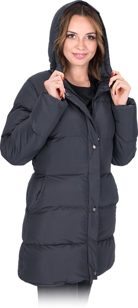 tkanina: 100% poliester z powłoką AC o gramaturze 65 g/m2 - wyściółka 100% poliester o gramaturze 410 g/m2 - podszewka 100% poliester o gramaturze 320 g/m2 - zapinana na dwustronny suwak z dodatkowym zapięciem na napy - kołnierz w formie stójki - kaptur z podszewką ściągany na troczki - dwie kieszenie w dolnej części - uniwersalny wygląd sprawia, że znajduje ona zastosowanie zarówno w pracy jak i w życiu codziennym - kurtka dopasowana do sylwetki