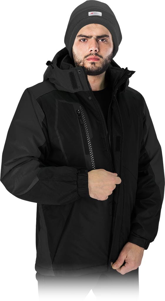 tkanina: powłoka 100% poliester powlekany PCV o gramaturze 150 g/m2 - wyściółka 100% poliester o gramaturze 160 g/m2 - podszewka górna część polar (100% poliester) o gramaturze 150 g/m2, dolna część oraz rękawy 100% poliester typu tafta 210T o gramaturze 60 g/m2 - zapinana na suwak z dodatkowym zapięciem na napy i rzepy - kołnierz w formie stójki - odsuwany kaptur z polarową podszewką ściągany na troczki z dodatkowym zapięciem na rzep dla lepszej ochrony głowy przed chłodem - dwie kieszenie w dolnej części zasłonięte padką oraz jedna na klatce piersiowej zapinane na suwak - dodatkowa kieszeń od wewnętrznej strony zapinana na rzep - rękawy zakończone ściągaczem z dodatkowym zapięciem na rzep - dół kurtki z możliwością ściągnięcia za pomocą troczków - odblaskowe elementy na klatce piersiowej