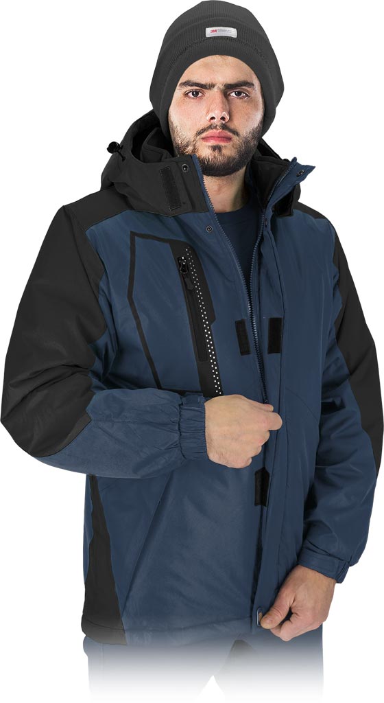 tkanina: powłoka 100% poliester powlekany PCV o gramaturze 150 g/m2 - wyściółka 100% poliester o gramaturze 160 g/m2 - podszewka górna część polar (100% poliester) o gramaturze 150 g/m2, dolna część oraz rękawy 100% poliester typu tafta 210T o gramaturze 60 g/m2 - zapinana na suwak z dodatkowym zapięciem na napy i rzepy - kołnierz w formie stójki - odsuwany kaptur z polarową podszewką ściągany na troczki z dodatkowym zapięciem na rzep dla lepszej ochrony głowy przed chłodem - dwie kieszenie w dolnej części zasłonięte padką oraz jedna na klatce piersiowej zapinane na suwak - dodatkowa kieszeń od wewnętrznej strony zapinana na rzep - rękawy zakończone ściągaczem z dodatkowym zapięciem na rzep - dół kurtki z możliwością ściągnięcia za pomocą troczków - odblaskowe elementy na klatce piersiowej