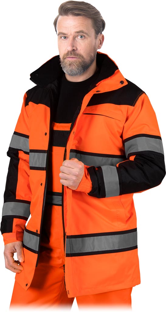 powłoka 100% poliester o gramaturze 180 g/m2 - wyściółka 100% poliester o gramaturze 180 g/m2 - podszewka 100% poliester o gramaturze 55 g/m2 - kołnierzyk ocieplany polarem - zapinana na zamek błyskawiczny z dodatkowym zapięciem na napy - od wewnątrz pikowana - dwie kieszenie w dolnej części oraz jedna na klatce piersiowej - na lewym rękawie kieszeń zapinana na suwak - po wewnętrznej stronie dodatkowa kieszeń zapinana na rzep - dodatkowa kieszeń wewnętrzna - rękawy zakończone ściągaczem z regulacją na rzepy - tkanina we fluorescencyjnym kolorze i pasy odblaskowe zwiększają widoczność - idealna dla drogowców i innych służb porządkowych
