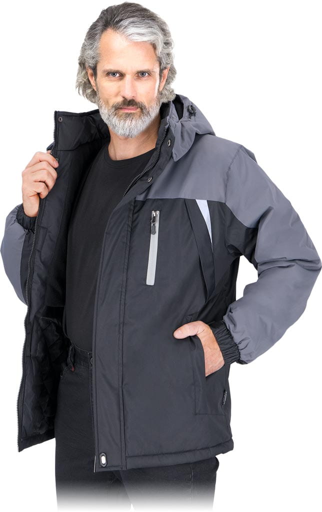 powłoka: 100% poliester powlekany PCV o gramaturze 150 g/m2 - wyściółka: 100% poliester o gramaturze 160 g/m2 - podszewka: górna część polar (100% poliester) o gramaturze 150 g/m2, dolna część oraz rękawy 100% poliester typu tafta 210T o gramaturze 60 g/m2 - zapinana na suwak z dodatkowym zapięciem na napy i rzepy - kołnierz w formie stójki - odsuwany kaptur z polarową podszewką ściągany na troczki z dodatkowym zapięciem na rzep dla lepszej ochrony głowy przed chłodem - dwie kieszenie po zewnętrznej stronie oraz jedna na klatce piersiowej zapinane na suwak - dodatkowa kieszeń od wewnętrznej strony zapinana na rzep - rękawy zakończone ściągaczem z dodatkowym zapięciem na rzep - dół kurtki z możliwością ściągnięcia za pomocą troczków - odblaskowe elementy