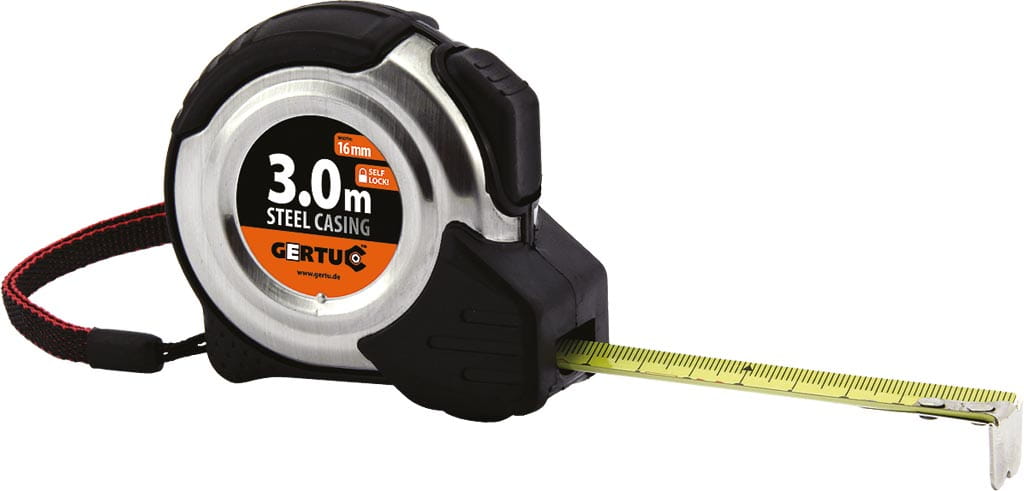 Miara zwijana. Stalowa obudowa z gumowymi wykończeniami. Grubość taśmy: 0.135 mm Dostępna w szerokościach: 16, 19 i 25 mm