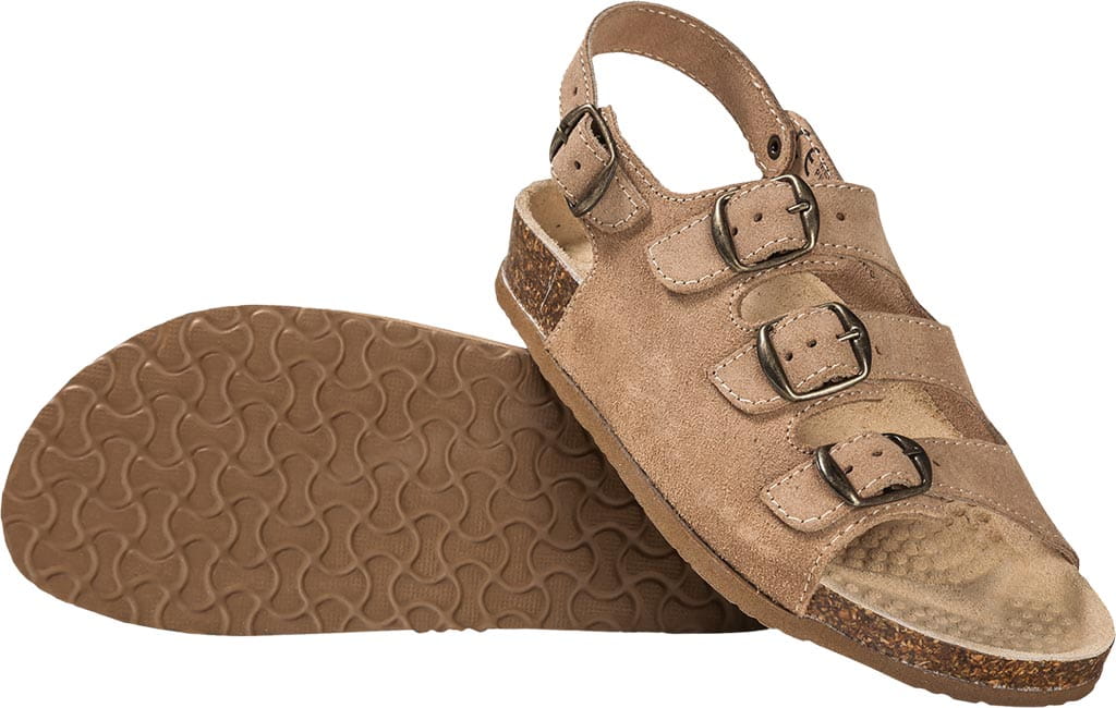 - wierzch z naturalnej miękkiej skóry z trzema paskami łączonymi klamerkami, które umożliwiają regulację tęgości oraz paskiem na pietę