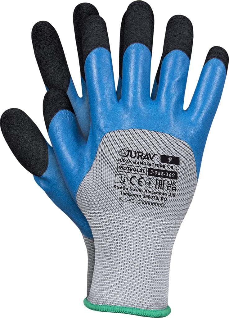 100% poliester (ścieg 13) - w części chwytnej i do połowy w części wierzchniej powlekane niebieskim lateksem typu FOAM - dodatkowe powleczenie czarnym lateksem typu FOAM na końcówkach palców - zakończone ściągaczem - od wewnątrz wysokiej jakości dzianina poliestrowa, która gwarantuje komfort użytkowania - wytrzymałość i wysoka jakość gwarantują zadowolenie użytkowników - wykorzystywane w budownictwie oraz przemyśle transportowym