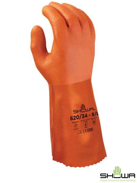 chemoodporne, stanowią zaawansowaną barierę ochroną dla dłoni, wykonane z trwałej tkaniny, którą w całości pokryto podwójną warstwą polichlorku winylu (PCV) - maksymalna swoboda ruchów - przedłużony, gładki mankiet zabezpieczający przed przesiąkaniem substancji - szorstka faktura na części chwytnej, gwarantująca pewność uchwytu w wilgotnym środowisku - antybakteryjne wykończenie, anatomiczny krój - mierzą od 30 do 32 cm długości w zależności od rozmiaru, a ich grubość wynosi 1,1 mm - znajdują zastosowanie w rolnictwie, przemyśle chemicznym, podczas natryskiwania i obróbki chemikaliami - zgodne z normami EN 388:2016+A1:2018 (3121X), EN ISO 21420:20202, EN ISO 374-1:2016+A1:2018 Typ C (JKL), EN ISO 374-5:2016