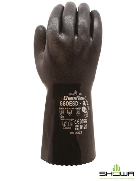 chemoodporne, stanowią zaawansowaną barierę ochroną dla dłoni, wykonane z trwałej tkaniny, którą w całości pokryto podwójną warstwą polichlorku winylu (PCV) - maksymalna swoboda ruchów - przedłużony, gładki mankiet zabezpieczający przed przesiąkaniem substancji - szorstka faktura na części chwytnej, gwarantująca pewność uchwytu w wilgotnym środowisku - antybakteryjne wykończenie, anatomiczny krój - mierzą od 30 do 32 cm długości w zależności od rozmiaru, a ich grubość wynosi 1,1 mm - znajdują zastosowanie w rolnictwie, przemyśle chemicznym, podczas natryskiwania i obróbki chemikaliami - zgodne z normami EN 388:2016+A1:2018 (3121X), EN ISO 21420:20202, EN ISO 374-1:2016+A1:2018 Typ C (JKL), EN ISO 374-5:2016