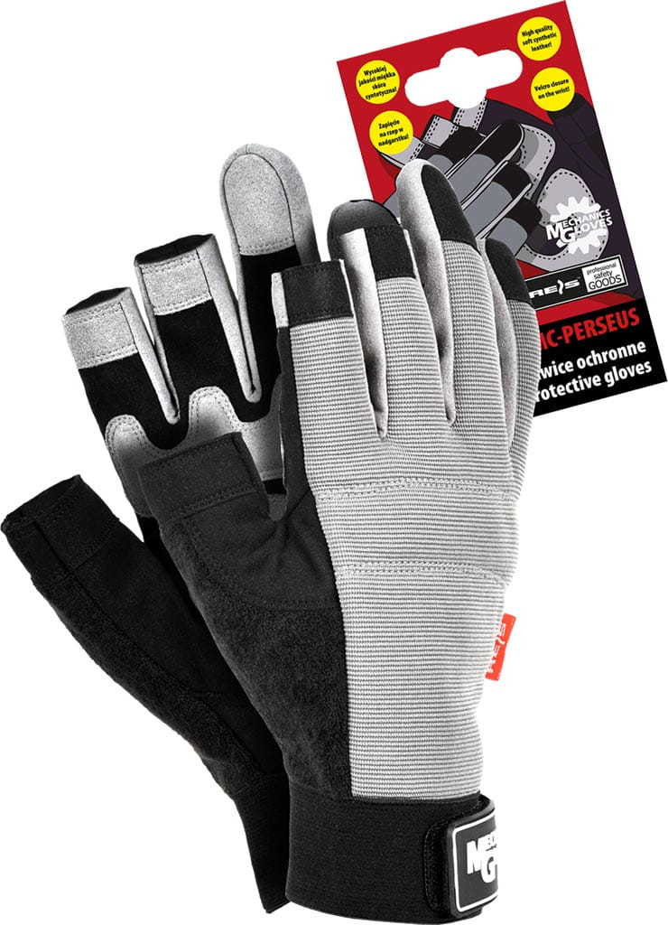 Rękawice ochronne wykonane z wysokiej jakości skóry syntetycznej połączonej z szarą tkaniną, bez końcówek na palcach