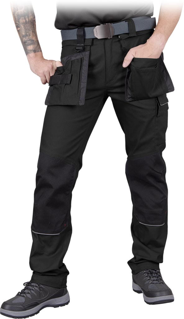 97% bawełna, 3% spandex typu canvas - gramatura 270 g/m2 - zapinane na guzik i zamek błyskawiczny - dwie boczne kieszenie, dodatkowo doszywane dwie kieszenie doskonałe do przechowywania narzędzi - dwie kieszenie z tyłu zapinane na rzep - cztery kieszenie na nogawkach, w tym dwie zapinane na rzep - gumki w pasie w bocznych partiach zwiększają swobodę ruchów oraz umożliwiają lepsze dopasowanie - kieszenie wykonane z poliestru OXFORD 300D - zwiększona wytrzymałość dzięki wstawkom na kolanach wykonanym z materiału Cordura - na kolanach kieszenie na wkładki nakolannikowe KING BEE - odblaskowe elementy zapewniają lepszą widoczność - idealne na upalne dni - spełniają wymagania normy EN ISO 13688