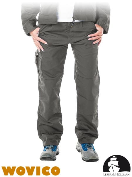 65% poliester, 35% bawełna - gramatura 270 g/m2 - technologia High Technology Fabric zapewnia wytrzymałość i odporność na wytarcia, zwiększa również odporność na smary, oleje i brud - na kolanach kieszenie na wkładki nakolannikowe KING BEE - dwie boczne kieszenie, dwie kieszenie z tyłu na napy - dodatkowe kieszenie na nogawkach w tym na telefon komórkowy - końcówka do przypięcia kluczy