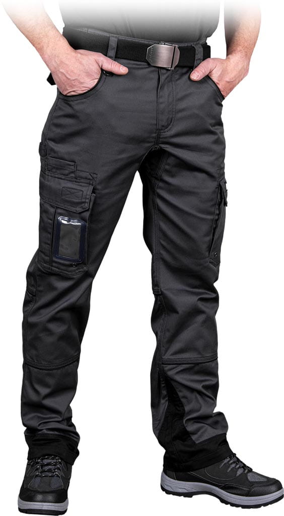 65% poliester, 35% bawełna - gramatura 260 g/m2 - zapinane na guzik i zamek błyskawiczny - dwie kieszenie po bokach - dwie kieszenie z tyłu zapinane na rzep - dwie kieszenie na nogawkach zapinane na rzep - na prawej nogawce jedna wąska kieszonka na przybory np. długopis oraz jedna na identyfikator - gumki w pasie w bocznych partiach zwiększają swobodę ruchów oraz umożliwiają lepsze dopasowanie - końcówka do przypięcia kluczy - uchwyt na narzędzia - spełniają wymagania normy EN ISO 13688