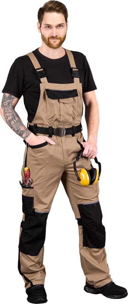 100% bawełna - gramatura 220 g/m2 - siateczkowe wstawki wykonane w 100% z poliamidu o gramaturze 250 g/m2 - dwie kieszenie na klatce piersiowej zapinane na rzep - dwie boczne kieszenie - dwie tylne kieszenie zapinane na rzep - cztery kieszenie na nogawkach, w tym dwie zapinane na rzep - gumka w pasie w tylnej partii zwiększa swobodę ruchów oraz umożliwia lepsze dopasowanie - możliwość regulacji długości za pomocą szelek, które to dodatkowo mają w tylnej partii gumkę - na kolanach kieszenie na wkładki nakolannikowe KING BEE - odblaskowe elementy zapewniają lepszą widoczność - zastosowanie siateczki wzdłuż nogawek oraz z tyłu na wysokości kolan zapewnia lepszą wentylację - zwiększona wytrzymałość dzięki wstawkom wykonanym z materiału Cordura - uchwyt na młotek na lewej nogawce - idealne na upalne dni