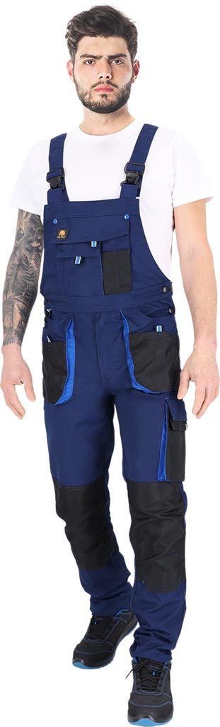 materiał główny: tkanina o splocie canvas 80% poliester, 20% bawełna o gramaturze 260 g/m2 - wstawki 100% poliester Oxford 600D o gramaturze 200 g/m2 - zapinane na zamek błyskawiczny zasłonięty patką - podwójna kieszeń na klatce piersiowej z dodatkowymi przegródkami - dwie podwójne kieszenie boczne z przegródkami oraz dwie tylne zapinane na rzep - kieszenie na nogawkach, w tym jedna na narzędzia - kieszenie na wkładki nakolannikowe wkładane od dołu - możliwość regulacji długości za pomocą szelek, które dodatkowo mają w tylnej partii gumkę - gumka w pasie w tylnej partii oraz guziki umożliwiające lepsze dopasowanie - końcówka do przypięcia kluczy - uchwyt na młotek na lewej nogawce