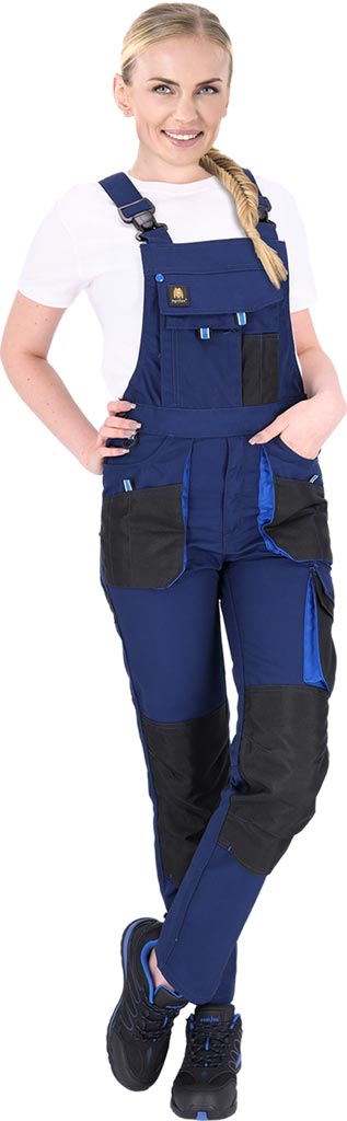 materiał główny: tkanina o splocie canvas 80% poliester, 20% bawełna o gramaturze 260 g/m2 - wstawki 100% poliester Oxford 600D o gramaturze 200 g/m2 - zapinane na zamek błyskawiczny zasłonięty patką - podwójna kieszeń na klatce piersiowej z dodatkowymi przegródkami - dwie podwójne kieszenie boczne z przegródkami oraz dwie tylne zapinane na rzep - kieszenie na nogawkach, w tym jedna na narzędzia - kieszenie na wkładki nakolannikowe wkładane od dołu - możliwość regulacji długości za pomocą szelek, które dodatkowo mają w tylnej partii gumkę - gumka w pasie w tylnej partii oraz guziki umożliwiające lepsze dopasowanie - końcówka do przypięcia kluczy - uchwyt na młotek na lewej nogawce