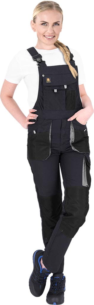 materiał główny: tkanina o splocie canvas 80% poliester, 20% bawełna o gramaturze 260 g/m2 - wstawki 100% poliester Oxford 600D o gramaturze 200 g/m2 - zapinane na zamek błyskawiczny zasłonięty patką - podwójna kieszeń na klatce piersiowej z dodatkowymi przegródkami - dwie podwójne kieszenie boczne z przegródkami oraz dwie tylne zapinane na rzep - kieszenie na nogawkach, w tym jedna na narzędzia - kieszenie na wkładki nakolannikowe wkładane od dołu - możliwość regulacji długości za pomocą szelek, które dodatkowo mają w tylnej partii gumkę - gumka w pasie w tylnej partii oraz guziki umożliwiające lepsze dopasowanie - końcówka do przypięcia kluczy - uchwyt na młotek na lewej nogawce