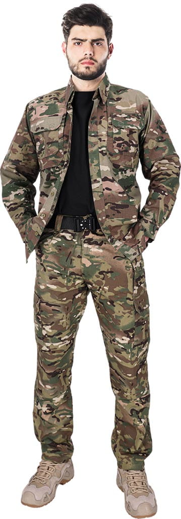 stop. - 65% poliester, 35% bawełna - gramatura 210-220 g/m2 - tkanina typu rip-stop - zabezpiecza przed rozdarciem w momencie zaczepienia o wystający przedmiot - bluza: zapinana na guziki; dwie kieszenie na klatce piersiowej zapinane na rzep; system wentylacji na plecach oraz pod pachami - spodnie do pasa: zapinane na napę i zamek błyskawiczny; możliwość regulacji w pasie dzięki gumce w bocznych partiach; liczne kieszenie m.in. dwie boczne, dwie z tyłu zapinane na rzep oraz kieszenie na nogawkach, w tym na telefon komórkowy; końcówka do przypięcia kluczy - dedykowane dla miłośników militariów, motocyklistów, motorowerzystów, podróżników, fanów paintballu - idealne dla firm ochroniarskich, leśników i rybaków - sprawdzi się podczas survivalu