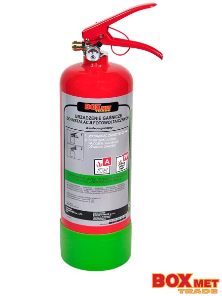 umożliwia gaszenie samych paneli słonecznych oraz związanej z nimi infrastruktury, np. okablowanie, inwertery itp., pod napięciem maksymalnym 1000 V - skuteczne w gaszeniu pożarów klasy A (materiały stałe, np. drewno, papier, tkanina itp.) - środek gaśniczy - wermikulit, aplikowany w postaci drobnej mgiełki błyskawicznie schładza instalację i gasi płomienie - powstała powłoka blokuje dostęp tlenu do paneli fotowoltaicznych, odcina dostęp światła, przez co zapobiega produkcji prądu oraz izoluje moduł blokując dalsze rozprzestrzenianie się ognia - zasięg efektywny do 5 metrów pozwala na działanie z bezpiecznej odległości od pożaru - ekologiczne oraz nieszkodliwe dla ludzi i środowiska – w 100% naturalny i nietoksyczny środek gaszący, obojętny chemicznie i sterylny biologicznie - posiada zawór bezpieczeństwa w głowicy - czynnik roboczy - dyspersyjny środek gaśniczy na bazie wermikulitu - czas działania ok. 20 s - zakres temperatur stosowania +5°C +60°C
