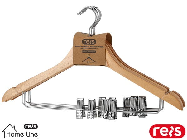 drewniany z metalową poprzeczką wyposażoną w klipsy - chromowany uchwyt z żelaza - nacięcia na ramionach - szerokość poprzeczki: 44,5 cm - do uniwersalnego użytku - gwarantuje bezpieczeństwo dla tkanin - zapewnia wentylację odzieży w garderobie - najmniejsza jednostka sprzedaży - 5 sztuk