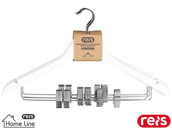 drewniany z metalową poprzeczką wyposażoną w klipsy - chromowany uchwyt z żelaza - nacięcia na ramionach - szerokość poprzeczki: 44,5 cm - do uniwersalnego użytku - gwarantuje bezpieczeństwo dla tkanin - zapewnia wentylację odzieży w garderobie - najmniejsza jednostka sprzedaży - 5 sztuk