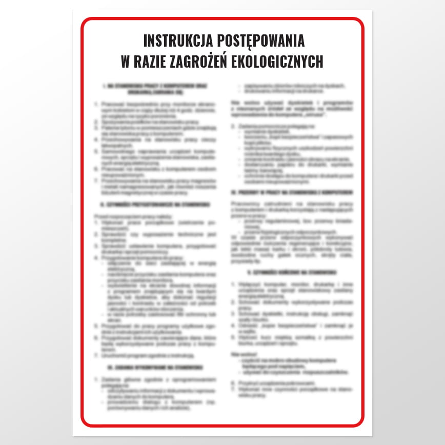 Obróbka materiałów i substancji chemicznych w zakładach produkcyjnych niesie ze sobą szereg zagrożeń związanych z możliwością wystąpienia pożaru, wybuchu lub zanieczyszczenia środowiska. Ważne jest zatem, aby na każdym stanowisku pracy znalazła się instrukcja postępowania w razie zagrożeń ekologicznych, dzięki której pracownicy zastosują odpowiednie procedury w przypadku wystąpienia zdarzenia niebezpiecznego. Tablica ostrzegawcza zawiera bowiem wszystkie niezbędne informacje odnośnie rozpoczęcia akcji ratunkowej.
