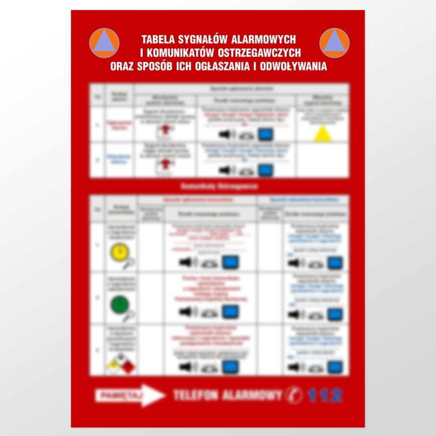 Tablica sygnałów alarmowych obrony cywilnej kraju może być również pomocą naukową dla nauczycieli i wykładowców. Tablica informacyjna zawiera bowiem szereg informacji z zakresu ogłaszania alarmów i komunikatów ostrzegawczych oraz ich odwoływania. Prosta i czytelna info grafika ułatwia zrozumienie i zapamiętania podstawowych komunikatów. Dodatkowo instrukcje BHP zawiera informacje o podstawowym numerze alarmowym. Tabliczka bezpieczeństwa ma wymiar 25 cm x 49 cm i wykonana jest z użyciem dobrej jakości materiałów. Nadruk zachowany jest w jaskrawej, przykuwającej uwagę kolorystyce.