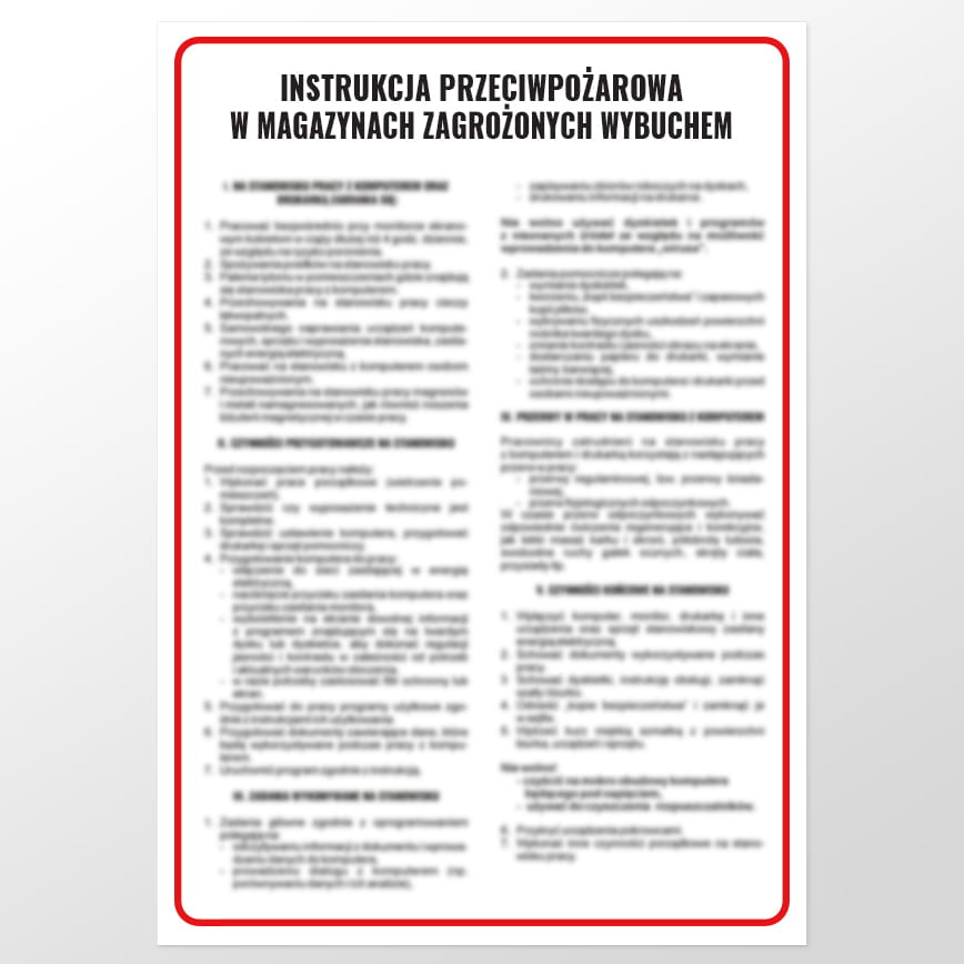 Instrukcje PPOŻ zawierają wszystkie niezbędne informacje, które są przydatne do rozpoczęcia akcji gaśniczej. Każda hala magazynowa powinna być zaopatrzona w znaki BHP odpowiednie do profilu jej działalności. Istotnym aspektem jest znajomość zasad bezpieczeństwa przeciwpożarowego wśród pracowników, łatwość w dotarciu do sprzętu gaśniczego oraz intuicyjność ścieżek ewakuacyjnych. Oferowana instrukcja przeciwpożarowa w magazynach zagrożonych wybuchem jest nośnikiem podstawowych zasad postępowania w przypadku stwierdzenia pożaru w miejscu składowania materiałów łatwopalnych.