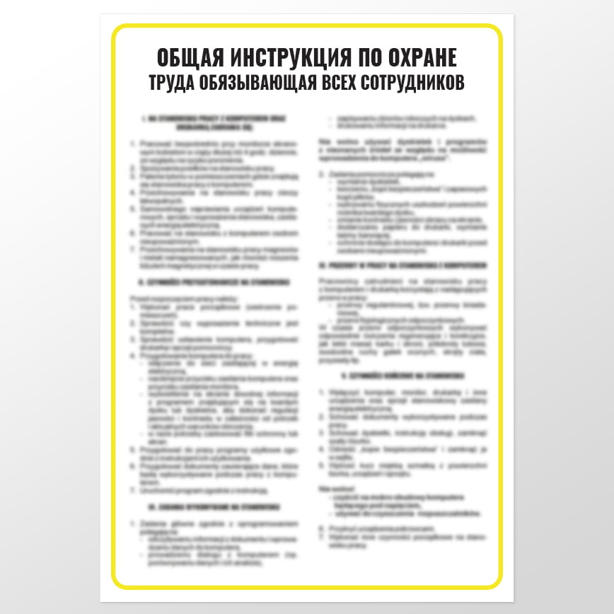 Znaki BHP w prosty i klarowny sposób informują o podstawowych zasadach bezpieczeństwa. Zawierają wszystkie niezbędne informacje, dzięki którym pracownicy mogą wykonywać swoją pracę w zgodzie z ogólnoobowiązującymi regulacjami. Oprócz tego zawierają podstawowe informacje o możliwości powstania zagrożenia i ostrzegają przed wykonywaniem czynności, które mogą spowodować wypadek. Rosyjska instrukcja ogólna BHP obowiązujące wszystkich pracowników ma wymiar 24,5 × 30, a treść jest nadrukowana czarną i trwałą czcionką na białym tle.