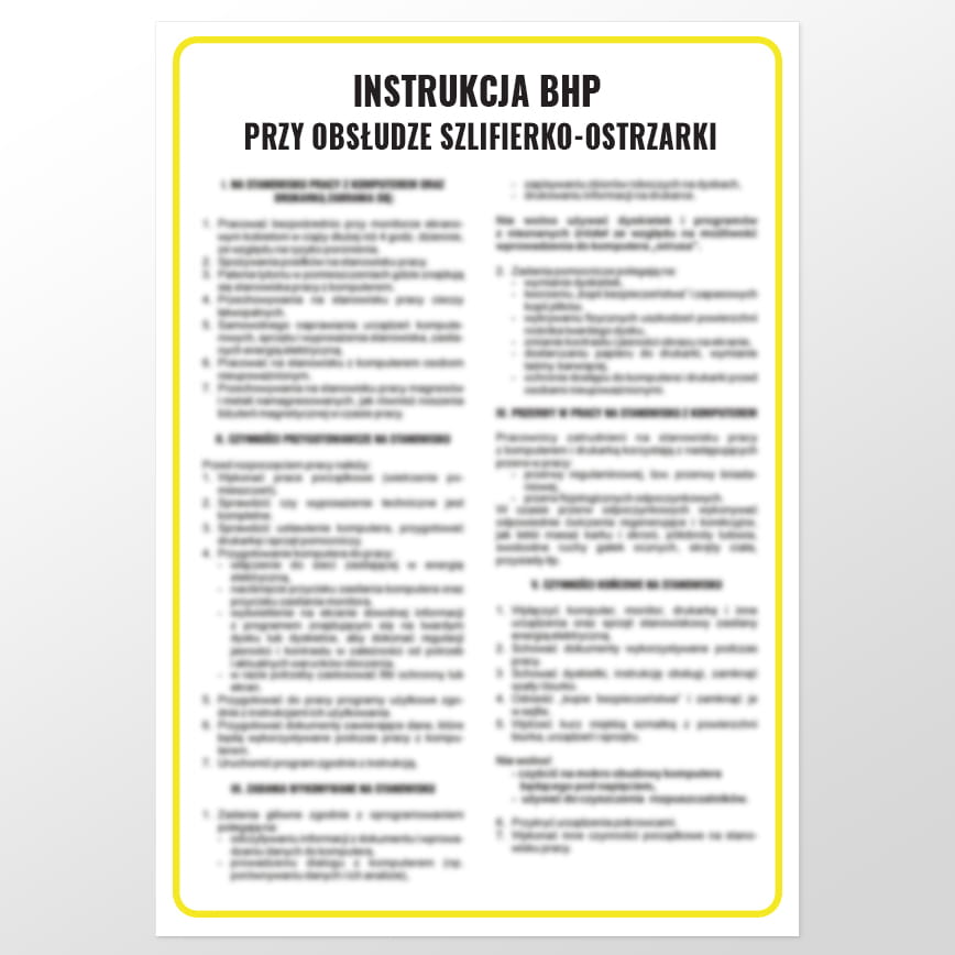 Proces szlifowania należy do kategorii czynności niebezpiecznych. W związku z tym każdy operator ostrzarki powinien stosować się do procedur bezpieczeństwa. Instrukcja BHP przy obsłudze szlifierko-ostrzarki powstała na podstawie profesjonalnej analizy ryzyka na stanowisku pracy szlifierza i zawiera konkretne informacje dotyczące procedur związanych z konserwacją sprzętu czy też postępowania w razie wypadku. Tablica BHP obligatoryjnie powinna znaleźć się na każdym stanowisku pracy związanym ze szlifowaniem lub ostrzeniem.
