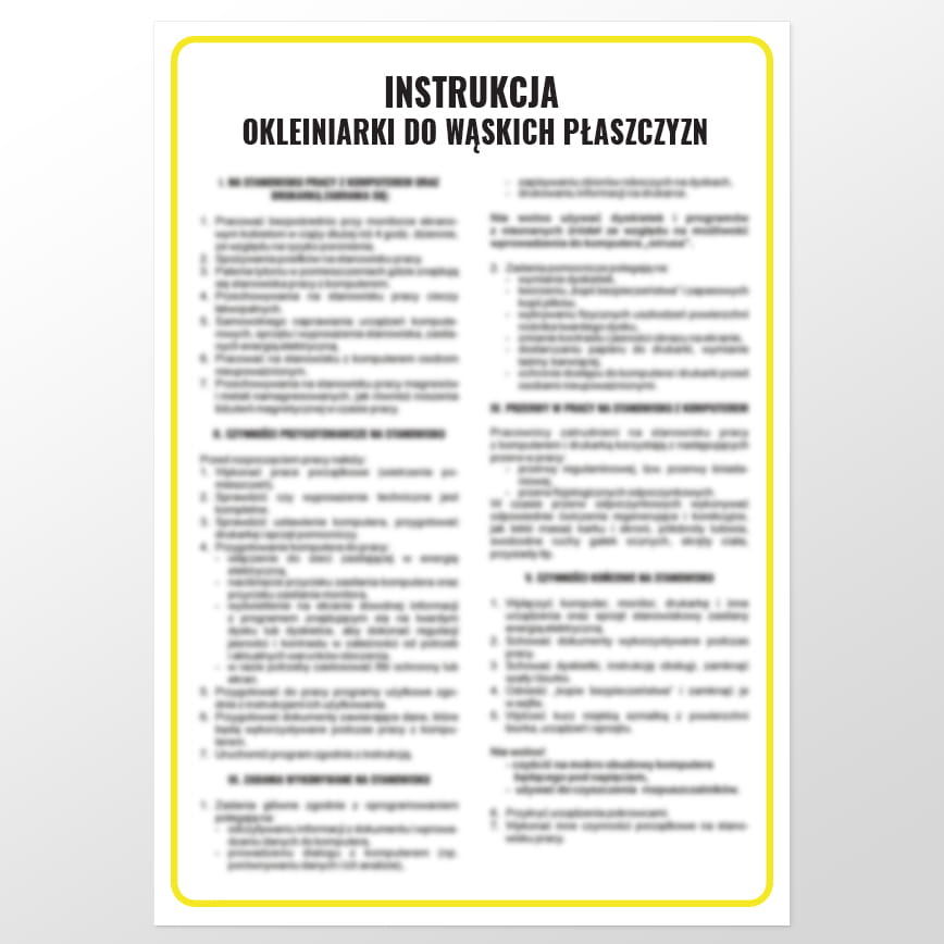 Jednym z wielu urządzeń stosowanych w warsztatach stolarskich są okleiniarki do gotowych wyrobów. Obsługa urządzeń oklejających niesie szereg zagrożeń, które określa instrukcja okleiniarki do wąskich płaszczyzn. Tablice ostrzegawcze zawieszone w obszarach objętych ryzykiem wypadku wpływają na bezpieczny przebieg pracy, zatem są obligatoryjne dla każdego zakładu produkcyjnego.