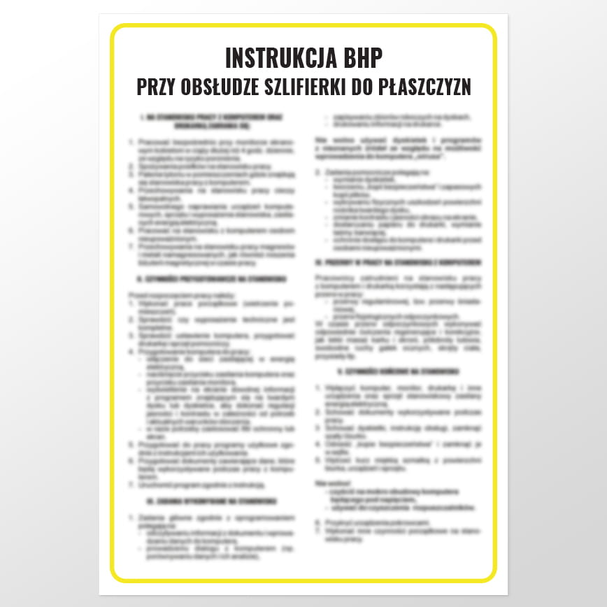 Znaki BHP jasno określają ogólnoobowiązujące procedury bezpieczeństwa oraz precyzują istniejące zagrożenia. Szlifierz narażony jest na kontakt z odpadami ze skrawarki oraz skaleczenie ostrymi krawędziami. Adekwatne tabliczki bezpieczeństwa wskażą na bezpieczny sposób wykonywania pracy. Nasza instrukcja BHP przy obsłudze szlifierki do płaszczyzn powstała, aby pomóc zminimalizować ryzyko wystąpienia nieszczęśliwego wypadku. Umieszczając ją na stanowisku pracy szlifierza można znacznie zmarginalizować ewentualne straty związane z możliwością wystąpienia niebezpiecznego zdarzenia.
