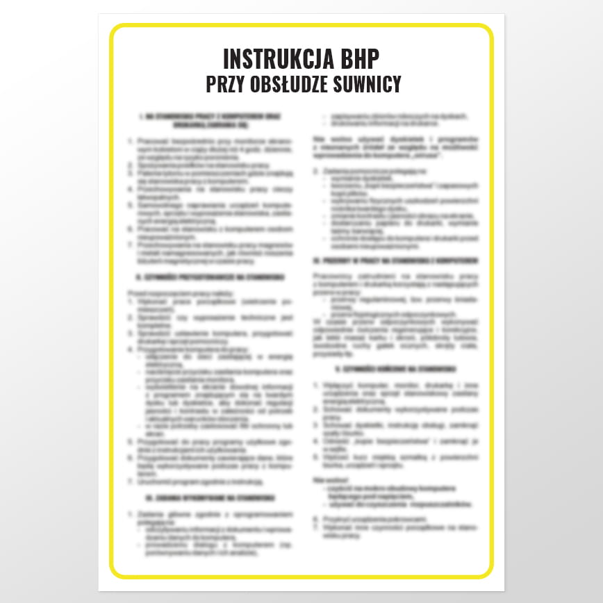 Instrukcja BHP przy obsłudze suwnicy zawiera informacje o potrzebnych kwalifikacjach oraz wymaganej do obsługi sprzętu wiedzy. Wskazuje na obowiązkowe do wykonania czynności przed rozpoczęciem pracy, w trakcie oraz po zakończeniu. Określa też zakazy i ostrzega przed zagrożeniami. Oferowana tablica BHP wykonana jest z wytrzymałych materiałów. Format instrukcji BHP to 24,5 cm x 35 cm. Treść naniesiona jest czarną czcionką na białym tle, co sprawia, że jest odpowiednio czytelna. Jaskrawożółta ramka przykuwa uwagę, dzięki czemu znak BHP jest widoczny z daleka.