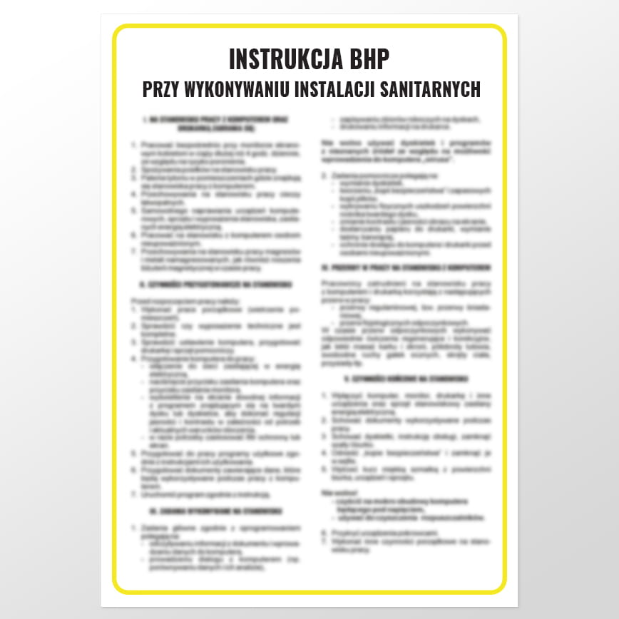 Instalacje sanitarne to zespół instalacji wewnątrzbudynkowych, do których zalicza się instalacje grzewcze, wodne, kanalizacyjne, gazowe i wentylacyjne. Podczas prac instalacyjnych w widocznym miejscu musi być zawieszona instrukcja BHP przy wykonywaniu instalacji sanitarnych, która opisuje właściwy sposób użytkowania specjalistycznego sprzętu oraz schemat postępowania w razie awarii lub usterki. Tablice BHP dla prac instalacyjnych powinny znajdować się na każdym placu budowy.