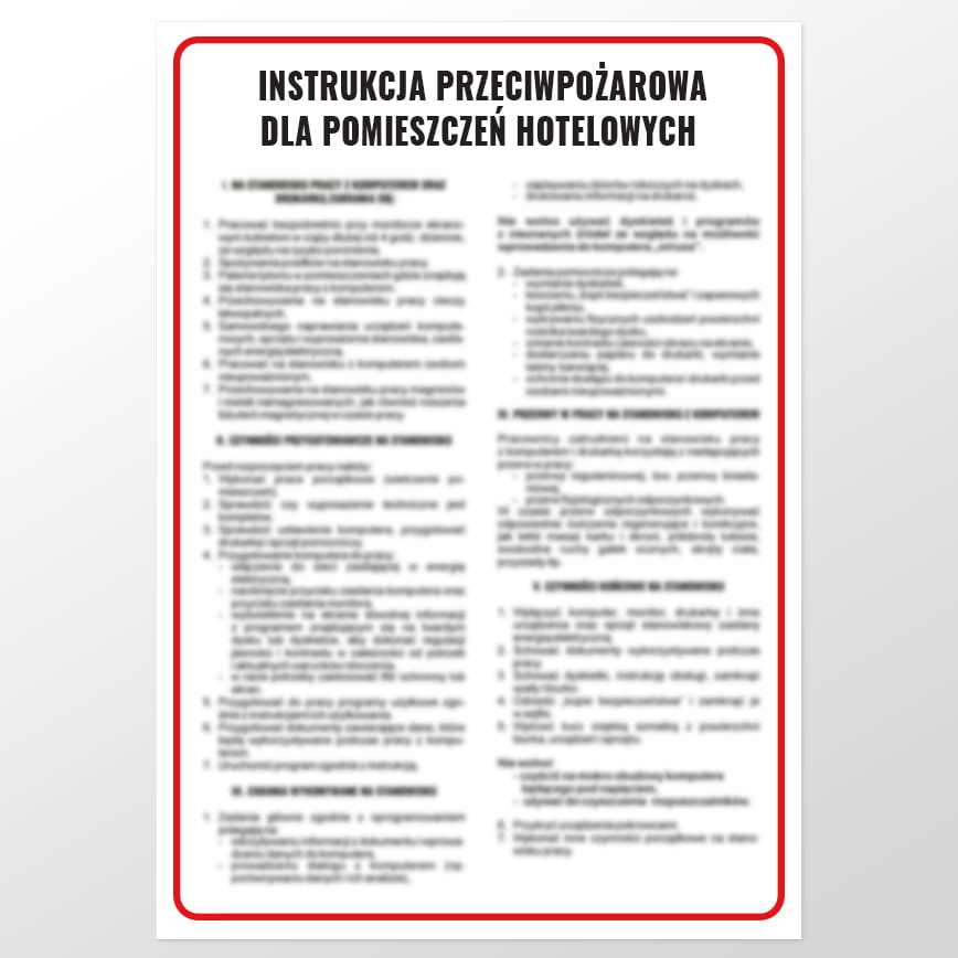 Pożar w hotelu może spowodować ogromne straty finansowe. Wiąże się też z ryzykiem utraty życia lub zdrowia wśród osób znajdujących się na jego terenie. Niezwykle istotną funkcję z tej perspektywy spełniają znaki BHP, które jasno precyzują zasady bezpieczeństwa. Instrukcje PPOŻ są zatem nieodzownym elementem wystroju korytarzy i części wspólnych kompleksów hotelowych. Natomiast tablica bezpieczeństwa, którą należy zawiesić w każdym hotelu to instrukcja przeciwpożarowa dla pomieszczeń hotelowych.