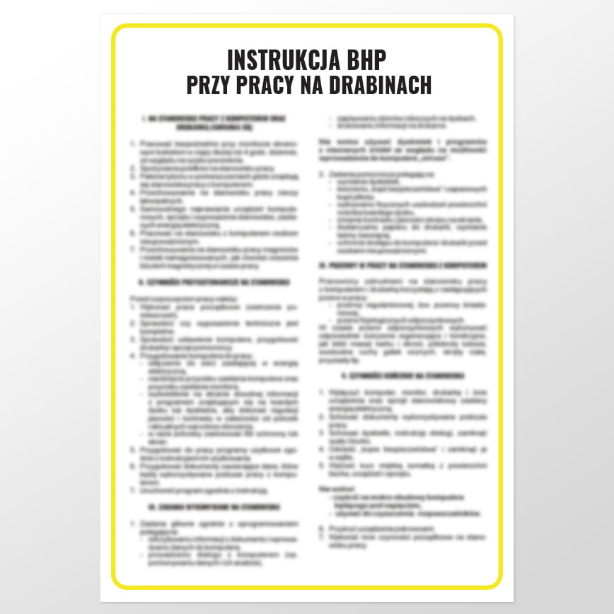 Instrukcja BHP przy pracy na drabinach opisuje zakres stosowania odzieży roboczej oraz wskazuje na konieczność sprawdzenia stanu technicznego konstrukcji drabiny przed użyciem. Pracownicy powinni wykonywać prace wyłączenie ze sprawnym i nieuszkodzonym sprzętem, co wpływa na zmniejszenie ryzyka wypadku. Oferowana tablica BHP dla prac budowlanych powstała w oparciu o obowiązujące standardy bezpieczeństwa oraz przepisy prawa budowlanego. Charakteryzuje się wysoką jakością wykonania oraz trwałością nadruku. Dostępny jest format 24,5 cm x 35 cm.
