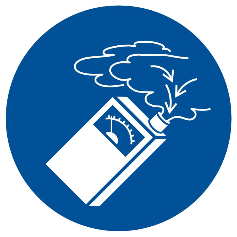 Znak nakazu stosowania detektora gazu to biały piktogram przedstawiający narzędzie pomiarowe, nad którym unosi się obłok sugerujący opary gazu. Wewnątrz obłoku znajdują się strzałki skierowane w stronę części urządzenia dokonującej pomiar. Całość umieszczona jest na niebieskim kole.