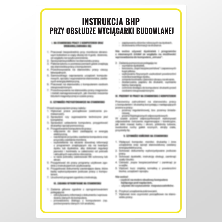 Pracownicy obsługujący wyciągarkę budowlaną powinni posiadać kamizelki odblaskowe oraz obuwie robocze. Przed rozpoczęciem prac pracowników należy zapoznać z zapisami instrukcji BHP przy obsłudze wyciągarki budowlanej, która wskazuje na prawidłowy sposób obsługi urządzenia. Ze względu na ryzyko przygniecenie upadającym elementem na skutek niewłaściwego montażu pracownicy powinni zachować niezbędne środki ostrożności a pracę wykonywać w sposób dokładny. Oferowany znak BHP dla maszyn budowlanych ma format 24,5 cm x 35 cm.