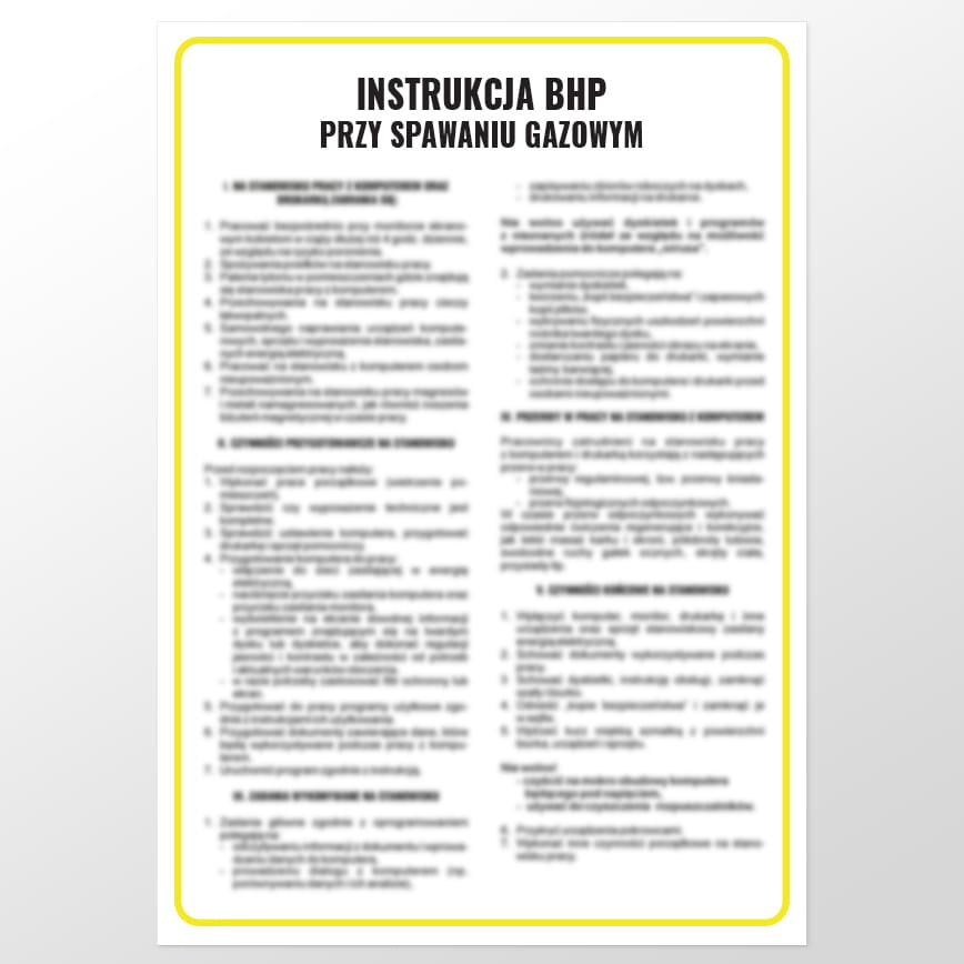Wysoka temperatura występująca w procesie spalania acetylenu powoduje zagrożenie poparzeniem. Oprócz tego spawacz ponosi ryzyko skaleczenia. Szkodliwy jest również kontakt z pyłem spawalniczym, który jest efektem ubocznym procesu. Niezbędne są zatem środki ochrony osobistej oraz tablice ostrzegawcze, które określają istniejące ryzyko. Oferowana instrukcja BHP przy spawaniu gazowym powstała z odpornych materiałów, dzięki czemu może zostać umieszczona w niewielkiej odległości od maszyn. Tablica BHP ma standardowy wymiar 24,5 cm x 35 cm.