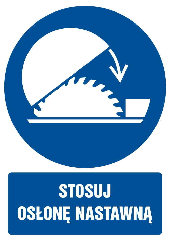 Znak bhp Stosuj osłonę nastawną z opisem wskazuje na konieczność stosowanie specjalnych elementów ochronnych na urządzeniach, a zwłaszcza na ruchowych częściach maszyny. Może on dotyczyć na przykład pił tarczowych czy innych elementów tnących. Osłony zapewniają wysoki poziom bezpieczeństwa oraz służą do zapobiegania wypadkom i urazom, w tym utracie kończyn. Profesjonalny znak spełniający wymagane normy powinien znaleźć się zwłaszcza na halach produkcyjnych oraz w miejscach, gdzie dokonuje się obróbki drewna lub metalu.