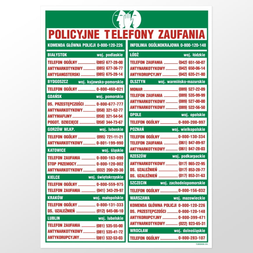 Policyjny telefon zaufania działa praktycznie w każdym województwie. Korzystanie ze wsparcia telefonicznego znacznie ułatwia tabliczka policyjnych telefonów zaufania, która umieszczona w widocznym i ogólnodostępnym miejscu może stać się cennym źródłem informacji. Tabliczki telefonów alarmowych są niezwykle ważne w kontekście zapewnienia bezpieczeństwa osób oraz udzielenia im potrzebnego wsparcia.